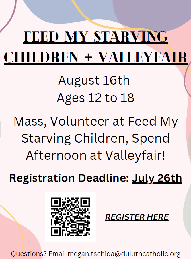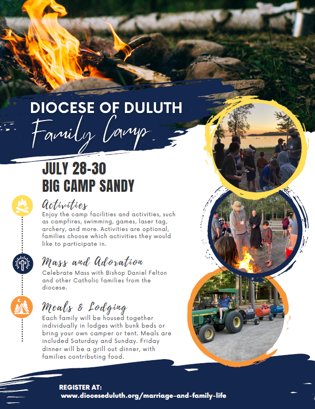 Camp Survive July 24-28 and July 31- August 4: Big Sandy Camp, McGregor Camp Grades: Completed 6-8. Camp Survive is a week-long junior high camp sponsored by the Diocese of Duluth. The primary focus of Camp Survive is to provide an atmosphere where our students are immersed in the richness and beauty of their Catholic faith. The sacraments are at the center of this camp. Students have the opportunity to attend daily Mass, go to confession, spend time worshipping our Lord in Adoration, and connect with other youth their age through small groups and the many traditional activities of camp.